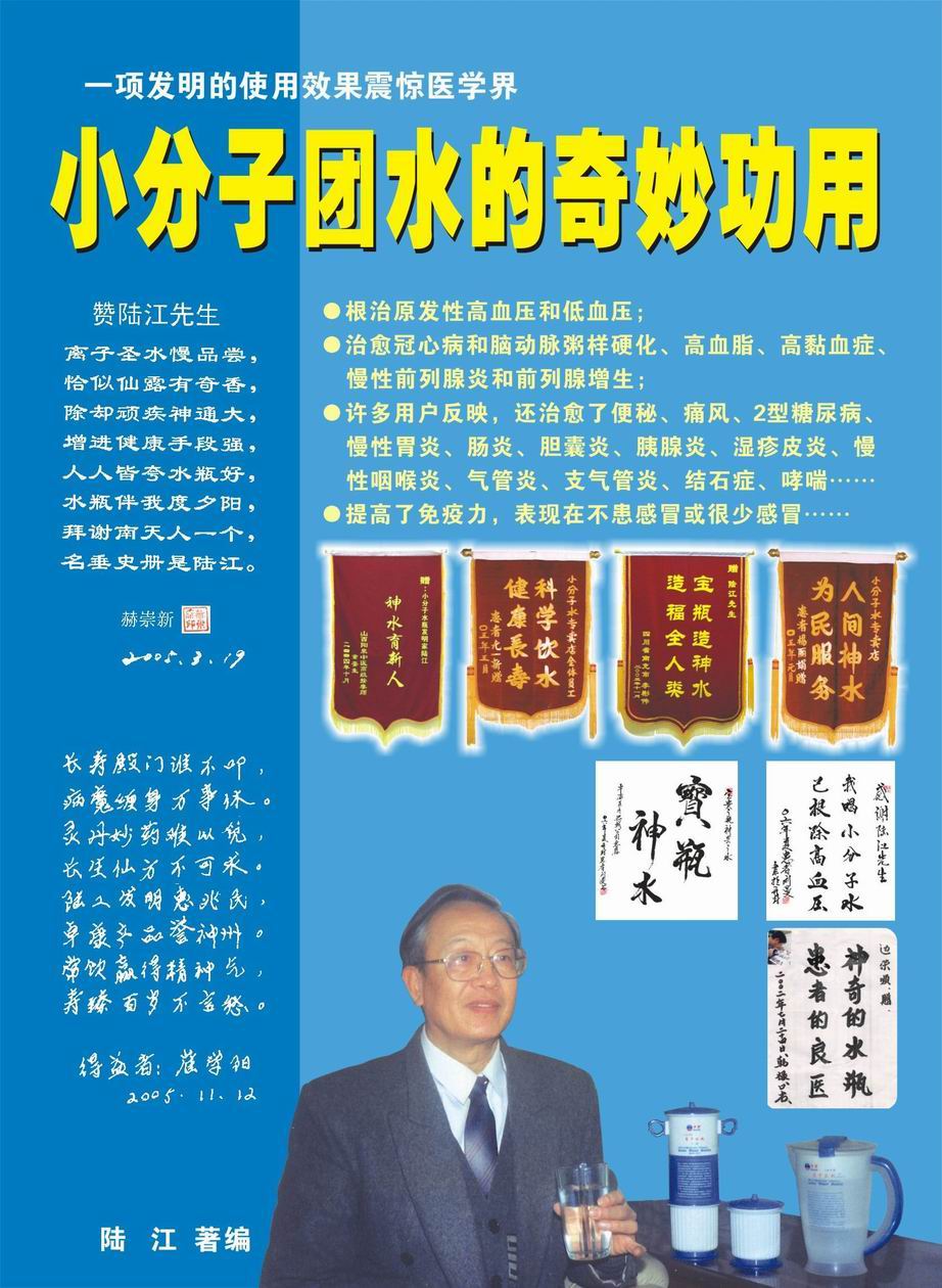 人類(lèi)幾千年來(lái)患以上病癥需終生服藥,幾十年也不能治愈。可是我國(guó)南寧的高級(jí)工程師陸 江,于1990年想根治高血壓,研究發(fā)明了離子水瓶,處理出微小分子團(tuán)水供飲用,經(jīng)過(guò)醫(yī)院臨床試用和專(zhuān)家鑒定,1999年獲中國(guó)發(fā)明專(zhuān)利權(quán),產(chǎn)品于2000年投放市場(chǎng)后一直跟蹤調(diào)查,據(jù)全國(guó)各地用戶(hù)反饋:祛除了高低血壓、糖尿病和冠心病,并使前列腺增生、咽喉炎、鼻竇炎、慢性氣管炎、支氣管炎、矽肺病、哮喘、慢性胃炎、腸炎、慢性膽囊炎、慢性腎炎、腎衰、膀胱炎、便秘、痔瘡、風(fēng)濕性關(guān)節(jié)炎和濕疹皮炎及中風(fēng)后遺癥等病癥不藥而愈。為什么喝微小水能治20多種病?陸 江從1991年德國(guó)科學(xué)家發(fā)現(xiàn)細(xì)胞膜水通道僅為2納米獲得啟發(fā),認(rèn)為多種器官患病是因細(xì)胞脫水,不能正常代謝和分裂增殖,才使器官細(xì)胞減少致衰弱萎縮而形成細(xì)胞缺水性病癥。22年來(lái)的實(shí)踐有力地支持了“細(xì)胞脫水致病”這一重要論點(diǎn),表明喝微小水可滿(mǎn)足細(xì)胞的生理需求,補(bǔ)水就能祛病,是生命科學(xué)新亮點(diǎn)。
