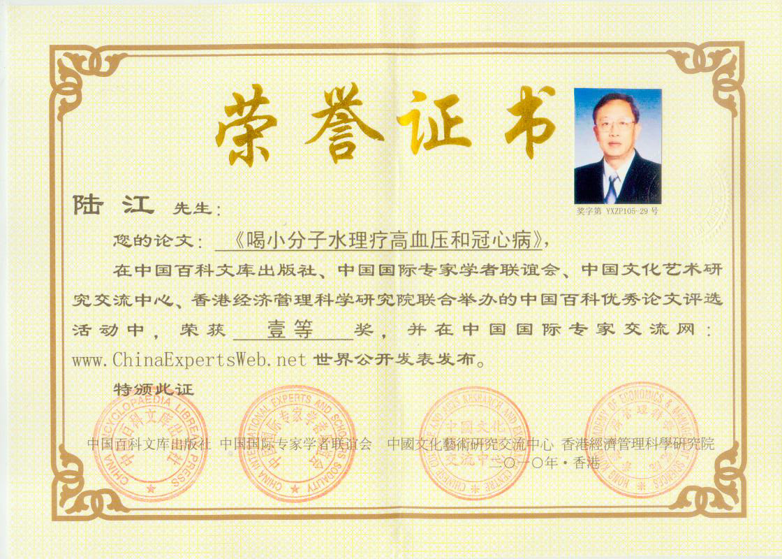 -----我是從事建筑的高工,本來(lái)沒(méi)有資格去攻克醫(yī)學(xué)難題,卻為了自身健康才扣響醫(yī)學(xué)的大門(mén)。由于我1990年患高血壓,因怕中風(fēng)才研究發(fā)明了離子水瓶,我把水處理成微小分子團(tuán)水,飲用后治愈了高血壓。便于1993年底送到三家省級(jí)醫(yī)院做臨床試用4個(gè)月。經(jīng)北京和廣西醫(yī)學(xué)專(zhuān)家鑒定:"降脂降壓效果好"," 能擴(kuò)大心腦動(dòng)脈流量,改善心腦電圖以及微循環(huán)","對(duì)治療心腦動(dòng)脈粥樣硬化、高血壓、高血脂有良好的醫(yī)療保健作用。""產(chǎn)品的技術(shù)性能和療效達(dá)到了同類(lèi)產(chǎn)品的國(guó)內(nèi)領(lǐng)先水平,經(jīng)廣西醫(yī)學(xué)科學(xué)情報(bào)研究所檢索,未見(jiàn)國(guó)外有類(lèi)似報(bào)道。"中國(guó)醫(yī)學(xué)科學(xué)院張正國(guó)教授從美國(guó)國(guó)立醫(yī)學(xué)圖書(shū)館數(shù)據(jù)庫(kù)存Medline檢索英俄文資料,均未見(jiàn)類(lèi)似報(bào)告。2000年上市后,我為了對(duì)消費(fèi)者負(fù)責(zé)而繼續(xù)觀察研究,一直通過(guò)《信譽(yù)卡》和《質(zhì)量跟蹤調(diào)查書(shū)》向患者承諾療效,請(qǐng)用戶(hù)使用6個(gè)月后反饋效果。和脂壓患者飲用2至5個(gè)月內(nèi),消除癥狀,停服藥物,血壓正常;冠心病患者飲用3~5個(gè)月逐漸減輕至消除心絞痛、房顫等癥狀,不再服藥,飲用1年左右心電圖正常,經(jīng)冠脈造影掃描無(wú)明顯狹窄,表明冠心病痊愈。大量患者還反映許多衰弱器官被修復(fù),讓前列腺增生、慢性咽喉炎、慢性氣管炎、支氣管炎、慢性胃炎、腸炎和膽囊炎等不藥而愈;2型糖尿病患者是因?yàn)橐葝u衰弱致病,飲用該水半年至一年,逐漸減藥至停藥,血糖尿糖正常,真正治愈2型糖尿病。中風(fēng)后遺癥患者飲用六七個(gè)月,可逐漸減輕至消除肢體和語(yǔ)言障礙,表明飲用該水能讓壽命很長(zhǎng)的神經(jīng)元細(xì)胞逐漸修復(fù),奇跡般地恢復(fù)肢體和語(yǔ)言功能。飲用后還使胸腺和脾臟兩個(gè)重要的免疫器官被修復(fù)和增強(qiáng),產(chǎn)生免疫細(xì)胞多,提高了免疫力,使人不生病或少生病。自此, 飲用微小分子團(tuán)水創(chuàng)造了攻克冠心病、高(低)血壓和糖尿病三大醫(yī)學(xué)難題的奇跡。人們對(duì)此感到不可思議,但實(shí)踐是檢驗(yàn)真理的唯一標(biāo)準(zhǔn)。